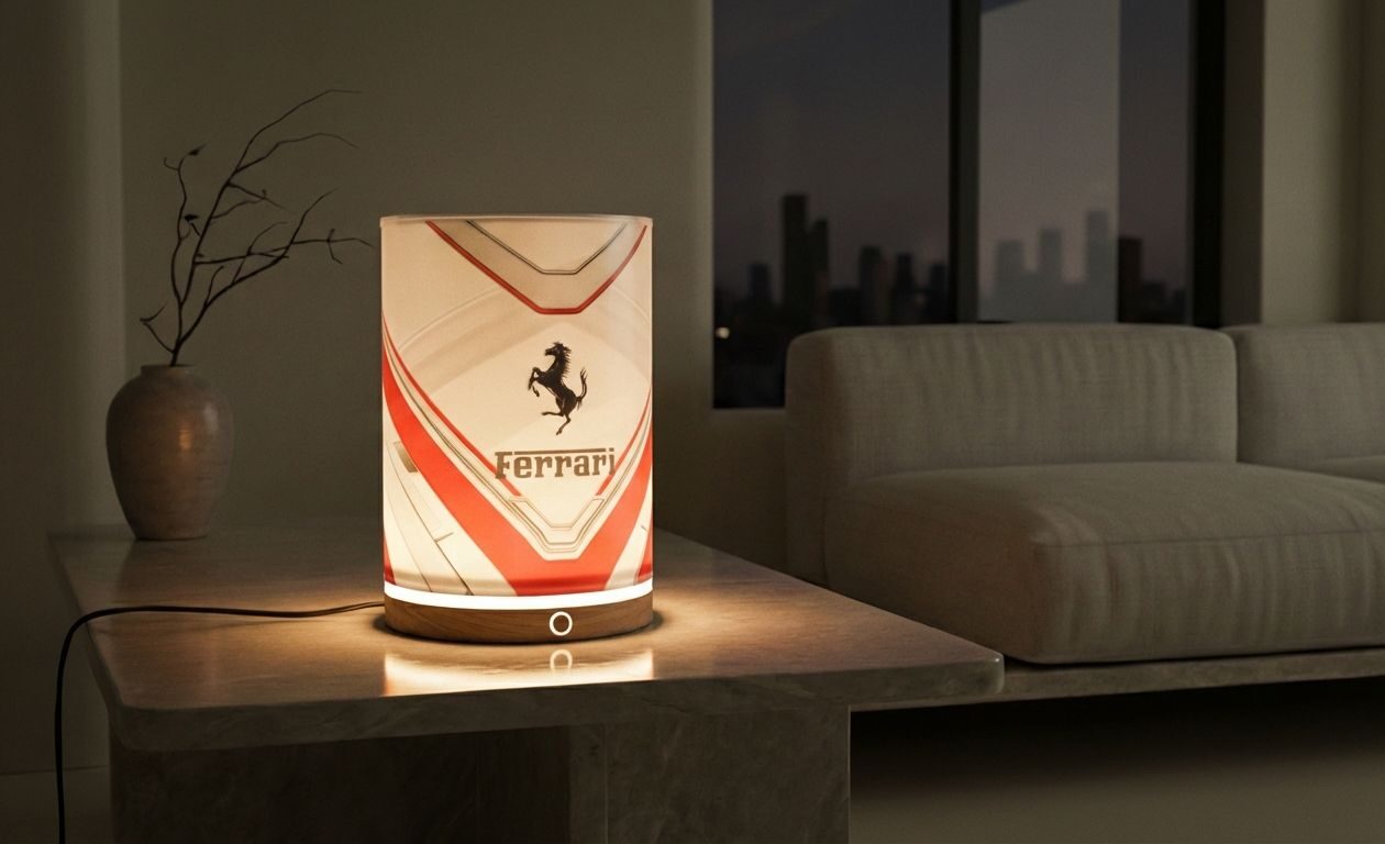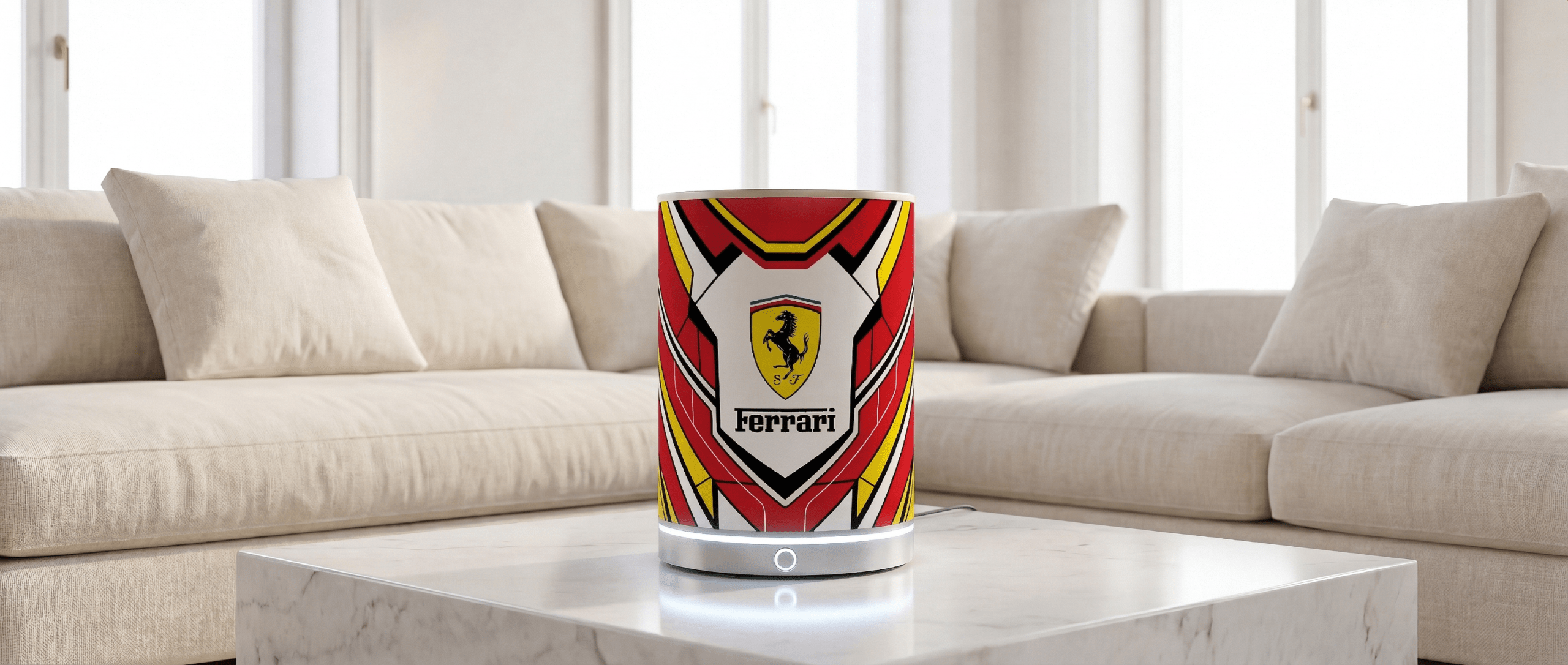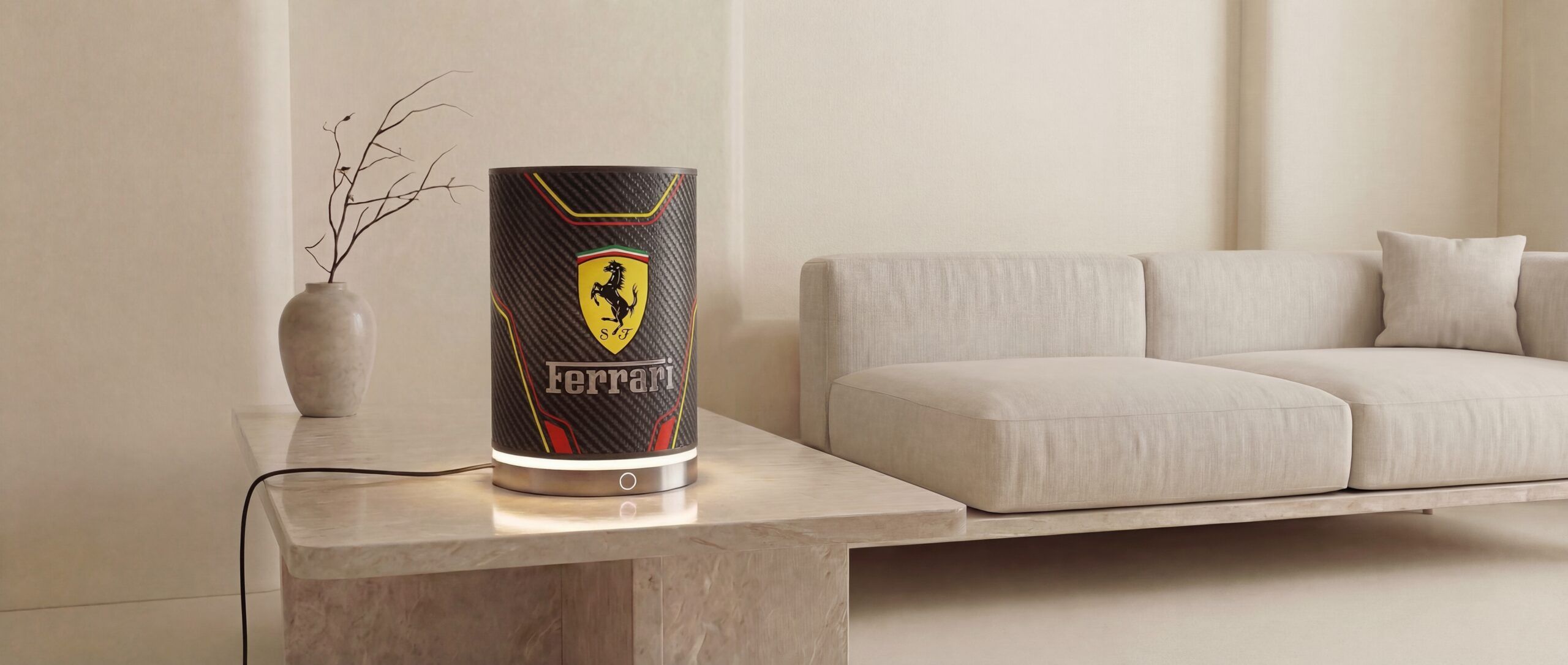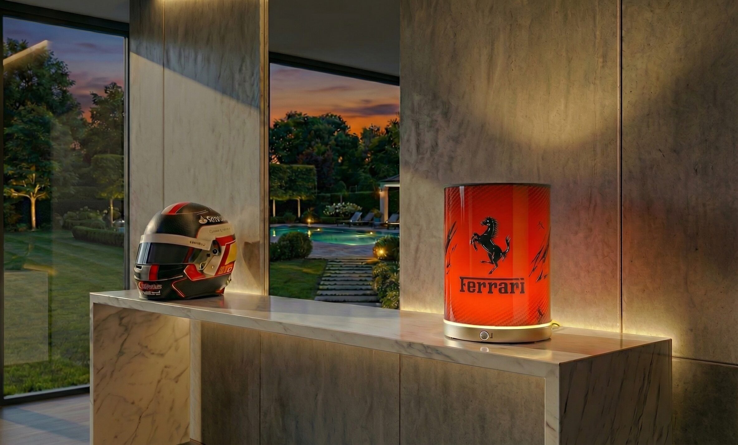 Lámpara Ferrari artesanal con 8 diseños para coleccionar. Exclusiva lámpara de edición limitada con altavoz Pioneer de 100W.